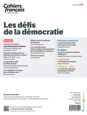 La France est l’une des plus anciennes démocraties ; un très large consensus existe aujourd’hui autour de ce régime dans lequel les citoyens désignent des gouvernants soumis au respect de règles bien définies. Pour autant, l’abstention devenue massive aux consultations électorales et le rejet important dont fait l’objet le personnel politique révèlent une insatisfaction des citoyens quant à la conduite des affaires du pays. La multiplication des crises sociales et politiques depuis 5 ans (« Gilets jaunes », mouvement « antivax », réforme des retraites, émeutes urbaines…) est symptomatique de cette défiance à l’égard du pouvoir. De nombreux facteurs sont avancés pour fournir une explication à ce malaise démocratique : essoufflement des institutions, radicalisation du débat public, perte d’un référentiel culturel commun, creusement des inégalités sociales… Ce numéro de Cahiers français propose d’analyser les principaux défis auxquels notre démocratie doit aujourd’hui faire face.