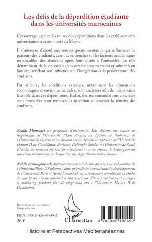 Cet ouvrage explore les causes des déperditions dans les établissements universitaires à accès ouvert au Maroc. Il s'intéresse d'abord aux sources préuniversitaires qui influencent le parcours des étudiants, avant de se pencher sur les facteurs académiques responsables des abandons après leur entrée à l'université. Le rôle déterminant de la vie sociale dans ces établissements est ensuite mis en lumière, révélant son influence sur l'intégration et la persévérance des étudiants. Par ailleurs, les conditions externes, notamment les dimensions économiques et environnementales, sont analysées afin de mieux saisir leur rôle dans ces déperditions. Enfin, des recommandations concrètes sont formulées pour renforcer la rétention et favoriser la réussite des étudiants.
