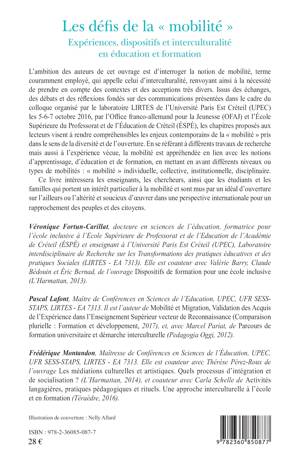 La mobilité est appréhendée en lien avec les notions d'apprentissage, d'éducation et de formation, en mettant en avant différents niveaux ou types de mobilités : « mobilités » individuelle, collective, institutionnelle, disciplinaire. Cet ouvrage poursuit l'objectif d'élargir la réflexion sur les différentes formes de « mobilités » que peut prendre la confrontation à la différence et à d'autres types de « culture » au niveau spatial, temporel et contextuel. Voici un ensemble de questionnements autour des thématiques principales de cette réflexion.
