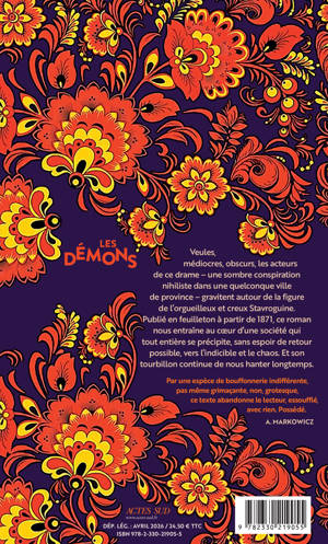 Veules, médiocres, obscurs, les acteurs de ce drame - une sombre conspiration nihiliste dans une quelconque ville de province - gravitent autour de la figure de l'orgueilleux et creux Stavroguine. Publié en feuilleton à partir de 1871, ce roman nous entraîne au coeur d'une société qui tout entière se précipite, sans espoir de retour possible, vers l'indicible et le chaos. Et son tourbillon continue de nous hanter longtemps. Par une espèce de bouffonnerie indifférente, pas même grimaçante, non, grotesque, ce texte abandonne le lecteur, essoufflé, avec rien. Possédé. A. MARKOWICZ