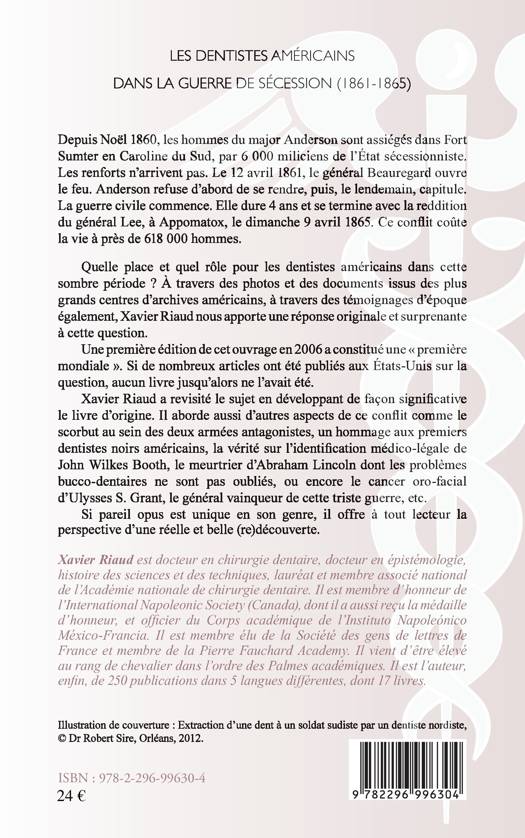 Quelle place et quel rôle pour les dentistes américains pendant la guerre de Sécession ? A travers des photos, des documents d'archives américains et des témoignages d'époque, cette deuxième édition développe le livre d'origine. De nouveaux aspects du conflit sont abordés : le scorbut au sein des deux armées, un hommage aux premiers dentistes noirs américains, la vérité sur l'identification médico-légale de John Wilkes Booth, etc.