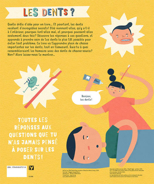 Quelle drôle d’idée pour un livre... Et pourtant, les dents recèlent d’incroyables secretsâ! D’où viennent-elles, qu’ây a-t-il à l’intérieur, pourquoi font-elles mal, et pourquoi poussent-elles seulement deux foisâ? Découvre les réponses à ces questions, et apprends à prendre soin de tes dents le plus tôt possible pour éviter tout problème. Ce livre va t’apprendre plein de choses importantes sur les dents, tout en t’amusant. Sais-tu à quoi ressembleraient les humains avec des dents de chauve-sourisâ? Nonâ? Alors laisse-nous te montrer...