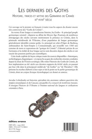 Cet ouvrage est le premier en français à traiter tous les aspects du dossier encore très controversé des "Goths de Crimée". Au terme d'une longue et tumultueuse histoire, les Goths - le principal peuple germanique oriental - disparaissent au début du Moyen Âge. Pourtant, de nombreux témoignages des siècles suivants mentionnent la présence en Crimée, dans la péninsule méridionale de l'Ukraine, d'une population de langue germanique généralement identifiée comme gothe. Le principal est celui d'Ogier de Busbecq, ambassadeur du Saint-Empire à Constantinople, qui recueille vers 1560 une centaine de mots et expressions du "gotique de Crimée". L'identité précise de ces Germains et la réalité de leur longue survie sont discutées depuis des siècles et ont suscité des passions parfois peu scientifiques. Cette étude exploite de façon critique toutes les sources disponibles - historiques, archéologiques, linguistiques - et expose les acquis des recherches récentes conduites depuis la chute de l'Union soviétique. Elle relate l'histoire des Goths de Crimée, de leur implantation au iiie siècle aux derniers rapports du xviiie siècle, en passant par leur rôle dans la principauté médiévale "de Gothie" ou "de Théodoro". Elle présente les mythes élaborés à leur sujet et fait le point sur le parler germanique de Crimée, dont un corpus (lexique étymologique) est donné en annexe.