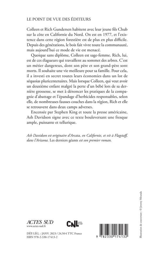 Colleen et Rich Gundersen habitent avec leur jeune fils Chub sur la côte en Californie du Nord. On est en 1977, et l'existence dans cette région forestière est de plus en plus diffcile. Depuis des générations, le bois fait vivre toute la communauté, mais aujourd'hui ce mode de vie est menacé. Quoique sans diplôme, Colleen est sage-femme. Rich, lui, est de ces élagueurs qui travaillent au sommet des arbres. C'est un métier dangereux, dont son père et son grand-père sont morts. Il souhaite une vie meilleure pour sa famille. Pour cela, il a investi en secret toutes leurs économies dans un lot de séquoias pluricentenaires. Mais lorsque Colleen, qui veut avoir un deuxième enfant malgré la perte d'un bébé lors de sa dernière grossesse, se met à dénoncer les pratiques de la compagnie d'abattage et l'épandage d'herbicides responsables, selon elle, de nombreuses fausses couches dans la région, Rich et elle se retrouvent dans deux camps adverses. Encensée par Stephen King et toute la presse américaine, Ash Davidson signe avec ce texte bouleversant une fresque ample, puissante et tellurique.