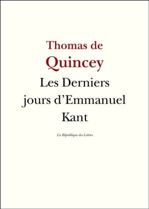 Publié en 1827, ce récit des derniers moments de la vie du philosophe, par un de ses prétendus secrétaires, est inspiré en fait des mémoires de différents contemporains de Kant, publiés en 1804, l'année de sa mort. Mais ce texte est empreint de De Quincey, sa fascination pour la mort, ses observations cliniques. Un sentiment d'oppression se dégage, la marche vers la mort.