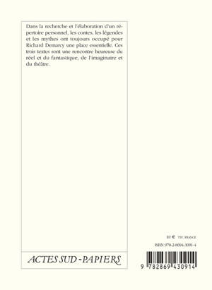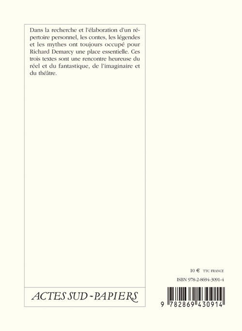 Dans la recherche et lélaboration d'un répertoire personnel, les contes, les légendes et les mythes ont toujours occupé pour Richard Demarcy une place essentielle. Ces trois textes sont une rencontre heureuse du réel et du fantastique, de l'imaginaire et du théâtre.