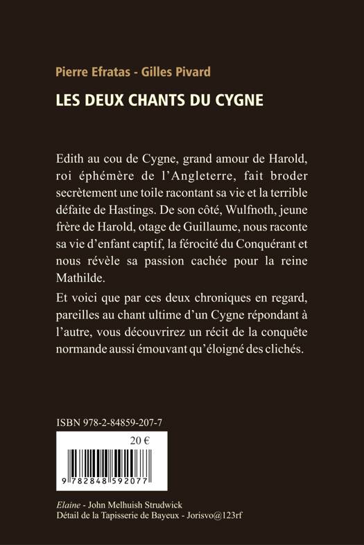 Edith au cou de Cygne, grand amour de Harold, roi éphémère de l'Angleterre, fait broder secrètement une toile racontant sa vie et la terrible défaite de Hastings. De son côté, Wulfnoth, jeune frère de Harold, otage de Guillaume, nous raconte sa vie d'enfant captif, la férocité du Conquérant et nous révèle sa passion cachée pour la reine Mathilde. Et voici que par ces deux chroniques en regard, pareilles au chant ultime d'un Cygne répondant à l'autre, vous découvrirez un récit de la conquête normande aussi émouvant qu'éloigné des clichés.