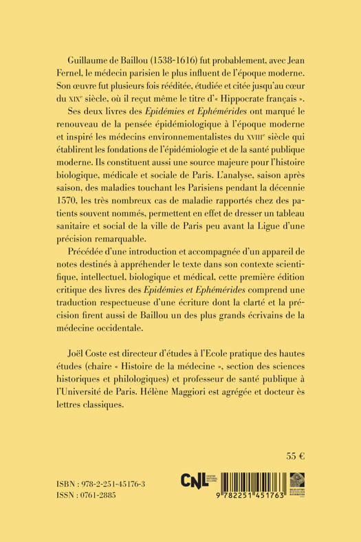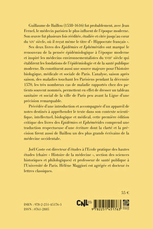 Guillaume de Baillou (1538-1616) fut probablement, avec Jean Fernel, le medecin parisien le plus influent de l'epoque moderne. Son oeuvre fut plusieurs fois reeditee, etudiee et citee jusqu'au coeur du XIXe siecle, ou il recut meme le titre d' Hippocrate francais . Ses deux livres des Epidemies et Ephemerides ont marque le renouveau de la pensee epidemiologique a l'epoque moderne et inspire les medecins environnementalistes du XVIIIe siecle qui etablirent les fondations de l'epidemiologie et de la sante publique moderne. Ils constituent aussi une source majeure pour l'histoire biologique, medicale et sociale de Paris. L'analyse, saison apres saison, des maladies touchant les Parisiens pendant la decennie 1570, les tres nombreux cas de maladie rapportes chez des patients souvent nommes, permettent en effet de dresser un tableau sanitaire et social de la ville de Paris peu avant la Ligue d'une precision remarquable. Precedee d'une introduction et accompagnee d'un appareil de notes destines a apprehender le texte dans son contexte scientifique, intellectuel, biologique et medical, cette premiere edition critique des livres des Epidemies et Ephemerides comprend une traduction respectueuse d'une ecriture dont la clarte et la precision firent aussi de Baillou un des plus grands ecrivains de la medecine occidentale.