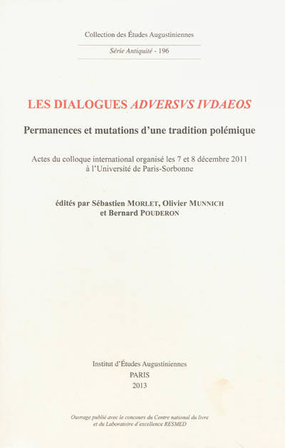 Les dialogues aduersus Iudaeos. Permanences et mutations d'une tradition polémique. Actes du colloque international organisé les 7 et 8 décembre 2011 à l'Université de Paris-Sorbonne, édités par Sébastien Morlet, Olivier Munnich et Bernard Pouderon.