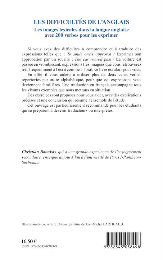 Si vous avez des difficultés à comprendre et à traduire des expressions telle que : To smile one's approval / Exprimer son approbation par un sourire, expressions très imagées que vous retrouverez très fréquemment à l'écrit comme à l'oral, ce livre est fait pour vous. En effet il vous aidera à utiliser plus de deux cents verbes répertoriés par ordre alphabétique, pour que ces expressions vous deviennent familières. Un ouvrage pour ceux qui se préparent à devenir traducteurs ou interprètes.