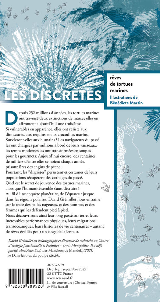 Depuis 252 millions d'années, les tortues marines ont traversé deux extinctions de masse ; elles en affrontent aujourd'hui une troisième. Si vulnérables en apparence, elles ont résisté aux dinosaures, aux requins et aux crocodiles marins. Survivront-elles aux humains ? Les navigateurs du passé les ont chargées par millions à bord de leurs vaisseaux, les temps modernes les ont transformées en soupes pour les gourmets. Aujourd'hui encore, des centaines de milliers d'entre elles se noient chaque année, prisonnières des engins de pêche. Pourtant, les "discrètes" persistent et certaines de leurs populations récupèrent des carnages du passé. Quel est le secret de jouvence des tortues marines, alors que l'humanité semble s'autodétruire ? Au fil d'une enquête planétaire, de l'équateur jusque dans les régions polaires, David Grémillet nous entraîne sur la trace des belles nageuses, et des hommes et des femmes qui les défendent pied à pied. Nous découvrirons ainsi leur long passé sur terre, leurs incroyables performances physiques, leurs migrations transocéaniques, leurs histoires de vie centenaires - autant de rêves éveillés pour un éloge de la lenteur.