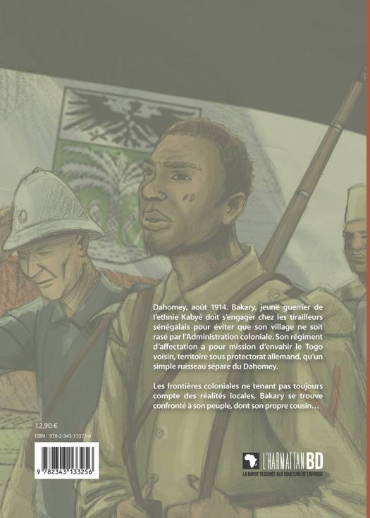 Dahomey, août 1914. Bakary, jeune guerrier de l'ethnie Kabyé doit s'engager chez les tirailleurs sénégalais pour éviter que son village ne soit rasé par l'Administration coloniale. Son régiment d'affectation a pour mission d'envahir le Togo voisin, territoire sous protectorat allemand, qu'un simple ruisseau sépare du Dahomey. Les frontières coloniales ne tenant pas toujours compte des réalités locales, Bakary se trouve confronté à son peuple, dont son propre cousin... Cette bande dessinée à la ligne claire évoque cette page méconnue de l'histoire de l'Afrique. (bande dessinée couleurs)