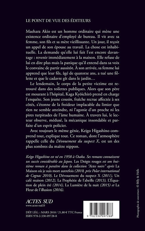 Maehara Akio est un homme ordinaire qui mène une existence ordinaire d'employé de bureau. Il vit avec sa femme, son fils et sa mère vieillissante. Un jour, il reçoit un appel de son épouse au travail. La chose est inhabituelle. La demande qu'elle lui fait l'est encore davantage : revenir immédiatement à la maison. Elle refuse de lui en dire plus mais la panique qu'il entend dans sa voix le convainc de partir aussitôt. À son arrivée, sa femme lui apprend que leur fils, âgé de quatorze ans, a tué une fillette et que le cadavre gît dans le jardin... Le lendemain, le corps de la petite victime est retrouvé dans des toilettes publiques. Alors que son père est mourant à l'hôpital, Kaga Kyōichirō prend en charge l'enquête. Son jeune cousin, fraîche recrue affectée à ses côtés, s'étonne de la froideur implacable du limier que rien ne semble atteindre, ni l'agonie d'un proche ni les pires turpitudes de l'âme humaine. À travers lui, le lecteur observe, médusé, la mécanique insondable et parfaite d'un esprit policier. Avec toujours le même génie, Keigo Higashino comprend tout, explique tout. Ce roman, dont l'atmosphère rappelle celle du Dévouement du suspect X, est un des plus sombres du maître nippon.