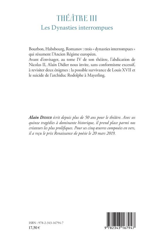 Bourbon, Habsbourg, Romanov : trois « dynasties interrompues » qui résument l'Ancien Régime européen. Avant d'envisager, au tome IV de son théâtre, l'abdication de Nicolas II, Alain Didier nous invite, sans conformisme excessif, à revisiter deux énigmes : la possible survivance de Louis XVII et le suicide de l'archiduc Rodolphe à Mayerling.