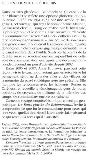 «Depuis 2003, Anne Brunswic a voyagé en Palestine, en Russie et en Bosnie. Ses reportages ont été accueillis dans »La Pensée de midi, La Lettre internationale, Le Journal des lointains «et sur la Radio Suisse romande. A Paris, elle partage son temps entre l'enseignement, la critique de cinéma et l'écriture. Derniers livres parus : »Bienvenue en Palestine, chroniques d'une saison à Ramallah« (Actes Sud, 2004 et Babel n° 755), prix RFI Témoin du monde 2004, et »Sibérie, un voyage au pays des femmes« (Actes Sud, 2006).»