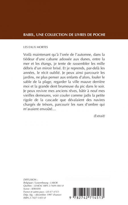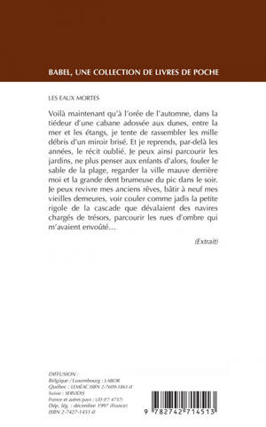Publié une première fois en 1975 par Albin Michel, Les Eaux mortes est le premier roman du poète, premier volet d'un tryptique consacré à la re-création de l'enfance. Il est suivi d'Un cimetière indien, qui a été réédité par Babel en mars 1996 (n° 204), après une première parution chez Albin Michel en 1981.