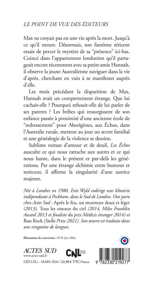 Max ne croyait pas en une vie après la mort. Jusqu'à ce qu'il meure. Désormais, son fantôme réticent essaie de percer le mystère de sa "présence" ici-bas. Coincé dans l'appartement londonien qu'il partageait encore récemment avec sa petite amie Hannah, il observe la jeune Australienne naviguer dans la vie d'après, cherchant en vain à se manifester auprès d'elle. Les mois précédant la disparition de Max, Hannah avait un comportement étrange. Que lui cachait-elle ? Pourquoi refusait-elle de lui parler de ses parents ? Les bribes qui ressurgissent de son enfance passée à proximité d'une ancienne école de "redressement" pour Aborigènes, aux Échos, dans l'Australie rurale, mettent au jour un secret familial et une généalogie de la violence se dessine. Sublime roman d'amour et de deuil, "Les Échos" ausculte ce qui nous rattache aux autres et ce qui nous hante, dans le présent et par-delà les générations. Par une étrange alchimie entre humour et noirceur, il affirme la singularité d'une autrice majeure.