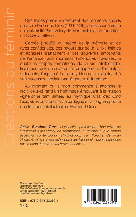 Ces textes précieux célèbrent des moments choisis de la vie d’Edmond Cros (1931-2019), professeur émérite de l’université Paul-Valéry de Montpellier et co-fondateur de la Sociocritique. Gardés jusqu’ici au secret de la mémoire et de rares confidences, ces retours sur soi à la fois intimes et adressés s’attachent à des souvenirs émouvants de l’enfance, aux moments historiques traversés, à quelques étapes formatrices de la vie intellectuelle, finalement aux épreuves et à l’engagement d’un enfant ardéchois d’origine à la fois mythique et modeste, et à son ascension sociale par l’étude et la littérature.