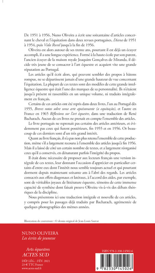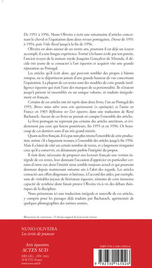 De 1951 à 1956, Nuno Oliveira a écrit une soixantaine d'articles concernant le cheval et l'équitation dans deux revues portugaises, Diana de 1951 à 1954, puis Vida Rural jusqu'à la fin de 1956. Oliveira est alors autour de ses trente ans, pourtant il est déjà un écuyer accompli, il a une longue expérience. Formé à la haute école par son parent, l'ancien écuyer de la maison royale Joaquim Gonçalves de Miranda, il décide très jeune de se consacrer à l'art équestre et acquiert vite une grande réputation au Portugal. Les articles qu'il écrit alors, qui peuvent sembler des propos à bâtons rompus, ne se départissent jamais d'une grande hauteur de vue concernant l'équitation. La plupart de ces textes sont des modèles de cette grande intelligence équestre qui était l'une des marques de sa personnalité. Ils n'étaient jusqu'à présent ni rassemblés en un unique volume, ni traduits intégralement en français. Certains de ces articles ont été repris dans deux livres, l'un au Portugal dès 1955, Breves notas sobre uma arte apaixonante (a equitação), et l'autre en France en 1965 Réflexions sur l'art équestre, dans une traduction de René Bacharach. Aucun de ces livres ne prenait en compte l'ensemble des articles. Le livre portugais ne reprenait pas certains des articles antérieurs, et évidemment pas ceux qui furent postérieurs, fin 1955 et en 1956. Or beaucoup de ces derniers sont d'un très grand intérêt. Quant au livre français, il n'a pas non plus retenu l'ensemble de cette production, même s'il a largement recouru à l'ensemble des articles jusqu'à fin 1956. Mais il a laissé de côté un certain nombre de textes, et a largement réorganisé ceux qu'il a conservés, en dénaturant parfois l'intégrité du propos. Il était donc nécessaire de proposer aux lecteurs français une version intégrale de ces textes, leur donnant l'occasion d'apprécier en particulier certains d'entre eux dont l'intérêt nous semble toujours actuel et qui pourtant dorment depuis maintenant soixante ans à l'abri des regards. Les articles consacrés aux effets diagonaux et latéraux, à l'accord des aides, par exemple, sont de véritables joyaux de littérature équestre, témoins de cette immense capacité de synthèse dont faisait preuve Oliveira vis-à-vis des débats théoriques de la discipline. Nous présentons ici une traduction intégrale et nouvelle de ces articles, y compris pour les passages déjà traduits par Bacharach, agrémentée de quelques photographies des mêmes années.