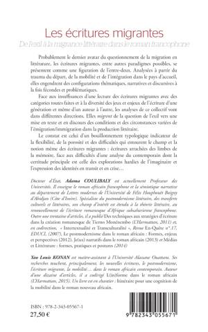 Probablement dernier avatar du questionnement de la migration en littérature, les écritures migrantes se présentent comme une figuration de l'entre-deux. Analysées à partir du trauma du départ, de la mobilité et de l'intégration dans le pays d'accueil, elles engendrent des configurations thématiques, narratives et discursives fécondes et problématiques. Les analyses de ce collectif migrent de la question de l'exil vers une mise en texte et en discours des conditions et circonstances de l'émigration/immigration dans la production littéraire.