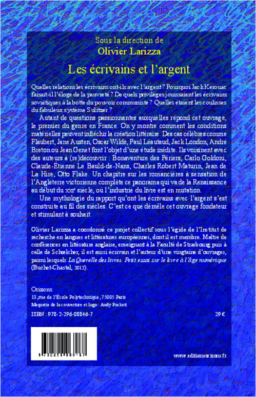 Quelles relations les écrivains ont-ils avec l'argent ? Pourquoi Jack Kerouac faisait-il l'éloge de la pauvreté ? De quels privilèges jouissaient les auteurs soviétiques à la botte du pouvoir communiste ? Quelles étaient les coulisses du fabuleux système Sulitzer ? Avec des chapitres sur Goldoni, Jane Austen, Flaubert, Maturin, Wilde, Léautaud, London, Breton, Genet , ce collectif montre comment les conditions matérielles infléchissent la création littéraire, de la Renaissance au début du XXIe siècle. Un ouvrage fondateur et stimulant.