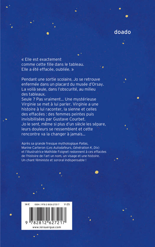 Une nuit au musée d'Orsay, Jo se retrouve enfermée dans le bâtiment. Seule au milieu des peintures de maîtres, une mystérieuse Virginie entre en contact avec elle. Elle a une histoire à lui raconter ou plutôt plusieurs, celles des effacées... Ces femmes peintes puis recouvertes ou invisibilisées par le même célèbre artiste : Gustave Courbet. Virginie raconte à Jo son histoire, lui parle de Jeanne, de Constance, d'Euphrasie. De tableaux comme L'origine du monde. Ses mots résonnent chez Jo, font un écho avec ce qu'elle vit, à son époque et changeront pour toujours le regard de la jeune femme. Après sa grande fresque mythologique Pallas, Marine Carteron et l'illustratrice Mathilde Foignet livrent un roman illustré bouleversant sur une facette de l'histoire de l'art peu connue.