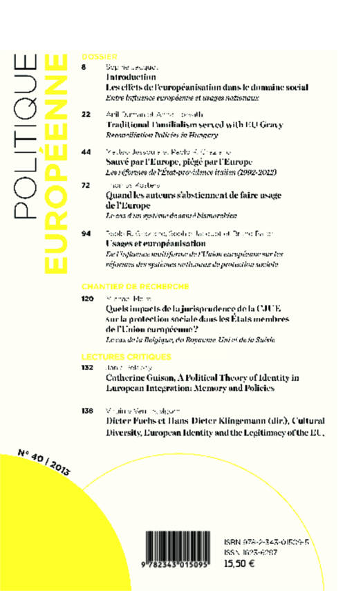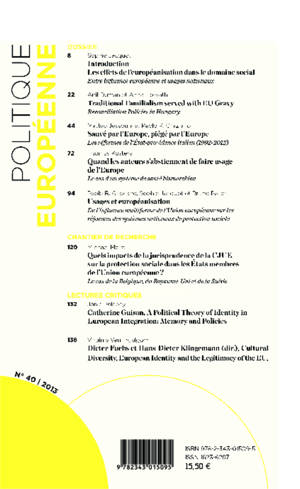 Au sommaire de ce numéro : Les effets de l'européanisation dans le domaine social / Traditional Familialism served with EU Gravy / Sauvé par l'Europe, piégé par l'Europe / Quand les auteurs s'abstiennent de faire usage de l'Europe / Usages et européanisation / Quels impacts de la jurisprudence de la CJUE sur la protection sociale dans les États membres de l'Union Européenne ?