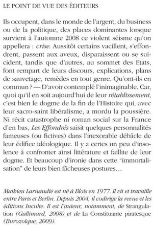 Ils occupent, dans le monde de l'argent, du business ou de la politique, des places dominantes lorsque survient à l'automne 2008 ce violent séisme qu'on appellera : crise. Aussitôt certains vacillent, s'effondrent, passent aux aveux, disparaissent ou se suicident, tandis que d'autres, au sommet des Etats, font rempart de leurs discours, explications, plans de sauvetage, remèdes en tout genre. Qu'ont-ils en commun ? — D'avoir contemplé l'inimaginable. Car, quoi qu'il en soit aujourd'hui de leur rétablissement, c'est bien le dogme de la fin de l'Histoire qui, avec leur sacro-saint libéralisme, a mordu la poussière. Ni récit catastrophe ni roman social sur la France d'en bas, Les Effondrés saisit quelques personnalités fameuses (ou fictives) dans l'inexorable débâcle de leur édifice idéologique. Il y a certes un peu d'insolence à confronter ainsi littérature et faillite de leur dogme. Et beaucoup d'ironie dans cette "immortalisation" de leurs bien fâcheuses postures...