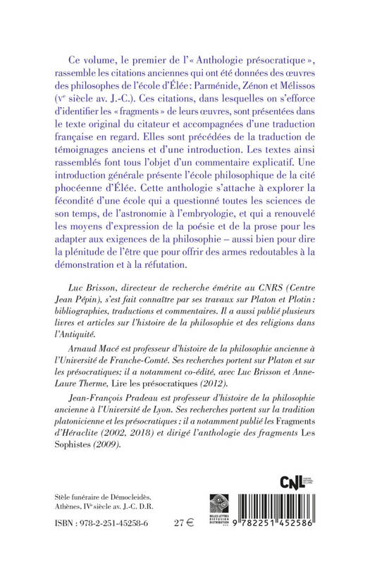 Ce volume, le premier de l' Anthologie presocratique , rassemble les citations anciennes qui ont ete donnees des oeuvres des philosophes de l'ecole d'Elee: Parmenide, Zenon et Melissos (Ve siecle av. J.-C.). Ces citations, dans lesquelles on s'efforce d'identifier les fragments de leurs oeuvres, sont presentees dans le texte original du citateur et accompagnees d'une traduction francaise en regard. Elles sont precedees de la traduction de temoignages anciens et d'une introduction. Les textes ainsi rassembles font tous l'objet d'un commentaire explicatif. Une introduction generale presente l'ecole philosophique de la cite phoceenne d'Elee. Cette anthologie s'attache a explorer la fecondite d'une ecole qui a questionne toutes les sciences de son temps, de l'astronomie a l'embryologie, et qui a renouvele les moyens d'expression de la poesie et de la prose pour les adapter aux exigences de la philosophie - aussi bien pour dire la plenitude de l'etre que pour offrir des armes redoutables a la demonstration et a la refutation.