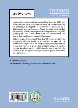 Les émotions ont une place particulière dans les différents domaines de la psychologie comme la communication, les processus d’adaptation, la mémoire, l’attention ou le développement de l’enfant. Parce qu’elles sont parfois vécues avec difficulté et engendrent des processus cognitifs spécifiques, elles permettent aussi de comprendre une partie des troubles psychopathologiques. Cet ouvrage offre une synthèse des différents modèles de la psychologie des émotions en insistant sur ceux dits de l’évaluation cognitive. Il en rappelle les principes d’étude et explore leur rôle dans des problématiques actuelles comme la robotique, la publicité ou la neuropsychologie. Il offre aussi un aperçu des principales psychothérapies émotionnelles.