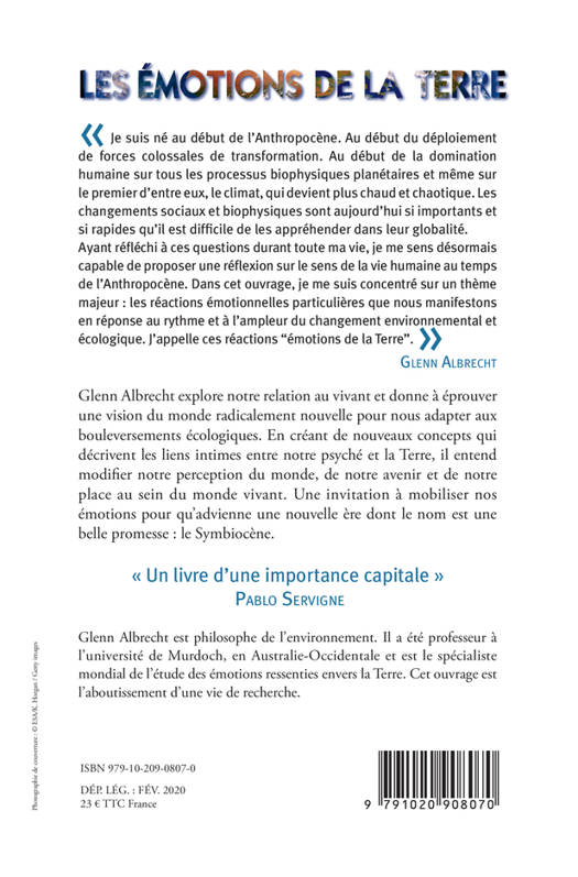 L'ampleur des bouleversements de l'Anthropocène est telle que les mots pour décrire les émotions n'existent pas toujours. Dans cet ouvrage, Glenn Albrecht propose une vision du monde radicalement nouvelle pour sortir de la crise écologique de l'ère Anthropocène et entrer dans une nouvelle ère qu'il appelle le Symbiocène, notamment en inventant de nouveaux noms pour qu'advienne un nouveau monde.