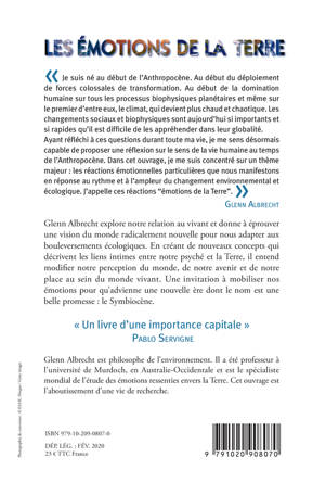 Son travail pionnier et très original porte sur l'identification et la description des émotions négatives ou positives envers la Terre. Les premières caractérisent l'Anthropocène, les secondes le Symbiocène. Il examine précisément les émotions « psychoterratiques » (découlant du lien entre la psyché et la Terre) négatives et positives ressenties face aux transformations de l'environnement en proposant de nombreux néologismes pour les caractériser. Pour se faire l'auteur s'appuie sur son expérience personnelle mais également sur les témoignages de colons australiens et indigènes confrontés à l'ouverture d'une mine de charbon à proximité de leur lieu de vie, et sur les nombreux auteurs qui, d'Hippocrate à Naomi Klein, ont traité des relations émotionnelles de l'homme à son environnement. Glenn Albrecht est l'inventeur du concept de « solastalgie » qu'il définit comme le mal du pays éprouvé sans avoir quitté son pays, consécutif à d'importantes transformations causées notamment par le changement climatique et le développement industriel. La « solastalgie » est devenu un concept important, objet de nombreuses recherches dans le monde entier et réutilisé y compris dans la littérature grand public. Cet ouvrage est l'aboutissement de 25 ans de recherches, qui en a fait le spécialiste mondial des effets psychologiques induits par les transformations de l'environnement.