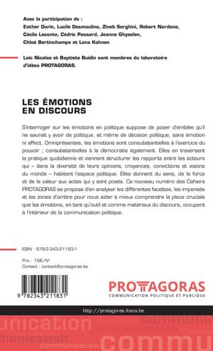 S'interroger sur les émotions en politique suppose de poser d'emblée qu'il ne saurait y avoir de politique, et même de décision politique, sans émotion ni affect. Omniprésentes, les émotions sont consubstantielles à l'exercice du pouvoir ; consubstantielles à la démocratie également. Elles en traversent la pratique quotidienne et viennent structurer les rapports entre les acteurs qui habitent l'espace politique. Elles donnent du sens, de la force et de la valeur aux actes qui y sont posés. Ce nouveau numéro des Cahiers PROTAGORAS se propose d'en analyser les différentes facettes, les impensés et les zones d'ombre pour nous aider à mieux comprendre la place cruciale que les émotions, en tant qu'outil et comme matériaux du discours, occupent à l'intérieur de la communication politique.