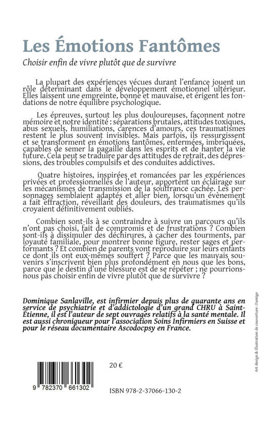 La plupart des expériences vécues durant l’enfance jouent un rôle déterminant dans le développement émotionnel ultérieur. Elles laissent une empreinte, bonne et mauvaise, et érigent les fondations de notre équilibre psychologique. Les épreuves, surtout les plus douloureuses, façonnent notre mémoire et notre identité : séparations brutales, attitudes toxiques, abus sexuels, humiliations, carences d’amours, ces traumatismes restent le plus souvent invisibles. Mais parfois, ils ressurgissent et se transforment en émotions fantômes, enfermées, imbriquées, capables de semer la pagaille dans les esprits et de hanter la vie future. Cela peut se traduire par des attitudes de retrait, des dépressions, des troubles compulsifs et des conduites addictives. Quatre histoires, inspirées et romancées par les expériences privées et professionnelles de l’auteur, apportent un éclairage sur les mécanismes de transmission de la souffrance cachée. Les personnages semblaient adaptés et aller bien, lorsqu’un évènement a fait effraction, réveillant des douleurs, des traumatismes qu’ils croyaient définitivement oubliés. Combien sont-ils à se contraindre à suivre un parcours qu’ils n’ont pas choisi, fait de compromis et de frustrations ? Combien sont-ils à dissimuler des déchirures, à cacher des tourments, par loyauté familiale, pour montrer bonne figure, rester sages et performants ? Et combien de parents vont reproduire sur leurs enfants ce dont ils ont eux-mêmes souffert ? Parce que les mauvais souvenirs s’inscrivent bien plus profondément en nous que les bons, parce que le destin d’une blessure est de se répéter ; ne pourrions-nous pas choisir enfin de vivre plutôt que de survivre ?