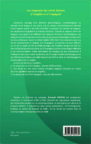 L'emprunt, passage d'un élément (phonologique, morphologique ou lexical) d'une langue à une autre, est un moyen d'enrichissement d'une langue quand il est bien contrôlé. Il provient du contact de langues, de l'expérience migratoire et d'autres facteurs... Cet ouvrage est divisé en 3 parties : 1. les emprunts du créole haïtien à l'anglais : environ 1400 entrées ; 2. une étude sur des mots créoles d'origine anglaise terminés en -mann (de man signifiant homme en anglais) ; 3. les emprunts du créole haïtien à l'espagnol : plus de 300 entrées.