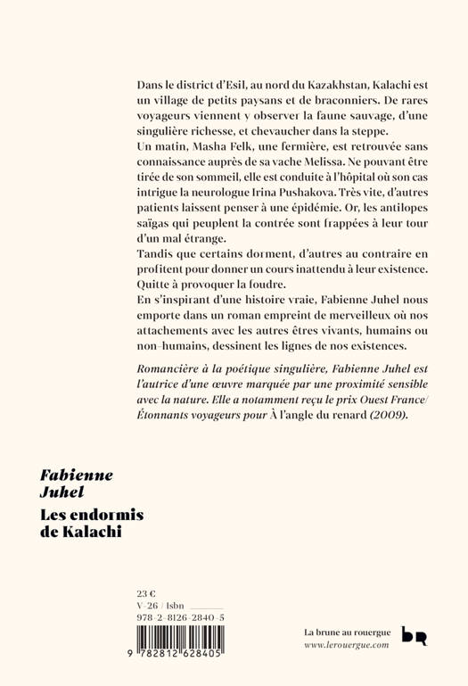 Dans le district d'Esil, au nord du Kazakhstan, Kalachi est un village de petits paysans et de braconniers. De rares voyageurs viennent y observer la faune sauvage, d'une singulière richesse, et chevaucher dans la steppe. Un matin, Masha Felk, une fermière, est retrouvée sans connaissance auprès de sa vache Melissa. Ne pouvant être tirée de son sommeil, elle est conduite à l'hôpital où son cas intrigue la neurologue de service, Irina Pushakova. Très vite, d'autres patients laissent penser à une épidémie. Or, les antilopes saïgas qui peuplent la contrée sont frappées à leur tour d'un mal étrange. Tandis que certains dorment, d'autres au contraire en profitent pour donner un cours inattendu à leur existence. Quitte à provoquer la foudre. En s'inspirant d'une histoire vraie, Fabienne Juhel nous emporte dans un roman empreint de merveilleux où nos attachements avec les autres êtres vivants, humains ou non-humains, dessinent les lignes de nos existences.