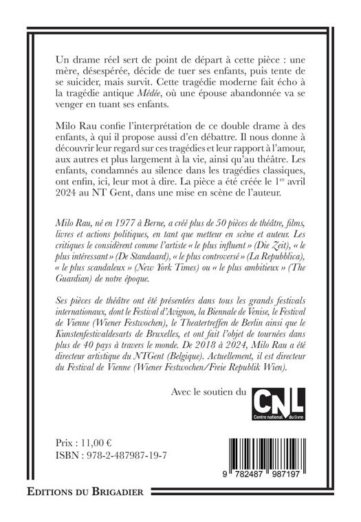 Un drame réel sert de point de départ à cette pièce : une mère, désespérée, décide de tuer ses enfants, puis tente de se suicider, mais survit. Cette tragédie moderne fait écho à la tragédie antique Médée, où une épouse abandonnée va se venger en tuant ses enfants. Milo Rau confie l’interprétation de ce double drame à des enfants, à qui il propose aussi d’en débattre. Il nous donne à découvrir leur regard sur ces tragédies et leur rapport à l’amour, aux autres et plus largement à la vie, ainsi qu’au théâtre. Les enfants, condamnés au silence dans les tragédies classiques, ont enfin, ici, leur mot à dire. La pièce a été créé le 1er avril 2024 au NT Gent, dans une mise en scène de l’auteur.