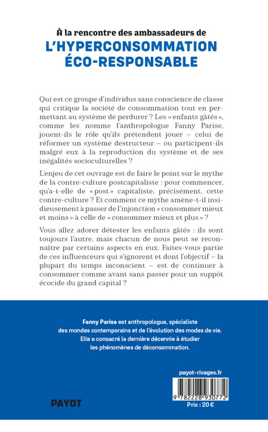 Qui est ce groupe d'individus sans conscience de classe qui critique la société de consommation tout en permettant au système de perdurer ? Les « enfants gâtés », comme les nomme l'anthropologue Fanny Parise, jouent-ils le rôle qu'ils prétendent jouer - celui de réformer un système destructeur - ou participent-ils malgré eux à la reproduction du système et de ses inégalités socioculturelles ? L'enjeu de cet ouvrage est de faire le point sur le mythe de la contre-culture postcapitaliste : pour commencer, qu'a-t-elle de « post » capitaliste, précisément, cette contre-culture ? Et comment ce mythe amène-t-il insidieusement à passer de l'injonction « consommer mieux et moins » à celle de « consommer mieux et plus » ? Vous allez adorer détester les enfants gâtés : ils sont toujours l'autre, mais chacun de nous peut se reconnaître par certains aspects en eux. Faites-vous partie de ces influenceurs qui s'ignorent dont l'objectif la plupart du temps inconscient est de continuer à consommer comme avant sans passer pour un suppôt écocide du grand capital ?