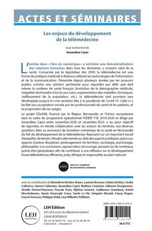 Le projet EDeTeN, financé par la Région Normandie et l’Union européenne dans le cadre du programme opérationnel FEDER/ FSE 2014-2020 et dirigé par Amandine Cayol entre novembre 2020 et novembre 2022, a eu pour objectif de répondre, en étroite collaboration avec les acteurs du territoire, aux diverses questions liées au processus de transition numérique de la santé en Normandie du fait du développement de la télémédecine. Reposant sur un important travail d’enquêtes de terrain, l’étude a été menée au-delà des aspects juridiques, grâce aux apports d’autres disciplines (aménagement du territoire, sociologie, psychologie, philosophie). Les conclusions, reprises dans cet ouvrage, peuvent sur de nombreux points être généralisées afin de contribuer à une réflexion sur le développement d’une télémédecine efficiente, juste, éthique et responsable au plan national.