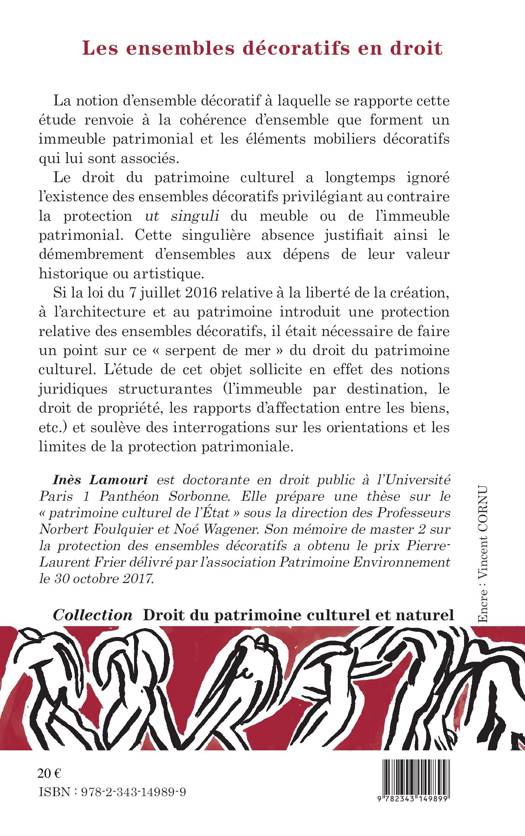 L'ensemble décoratif renvoie à la cohérence d'ensemble que forment un immeuble patrimonial et les éléments mobiliers décoratifs qui lui sont associés. Le droit du patrimoine culturel a longtemps ignoré cette notion. Cette absence justifiait le démembrement d'ensembles aux dépens de leur valeur historique ou artistique. Si la loi du 7 juillet 2016 relative à la liberté de la création, à l'architecture et au patrimoine introduit une protection relative des ensembles décoratifs, il était nécessaire de faire un point sur le droit du patrimoine culturel.