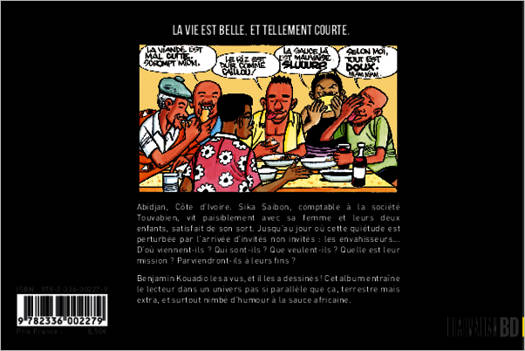 Abijan, Côte d'Ivoire. Sika Saibon, comptable de la société Touvabien, vit paisiblement avec sa femme et leurs deux enfants. Jusqu'au jour où cette quiétude est perturbée par l'arrivée d'invités non invités: les envahisseurs... D'où viennent-ils ? Qui sont-ils ? Que veulent-ils ? Quelle est leur mission ? Parviendront-il à leurs fins ? Cet album entraîne le lecteur dans un univers nimbé d'humour à la sauce africaine. (Illustration en noir et blanc).