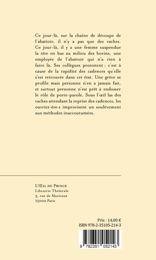 Ce jour-là, sur la chaîne de découpe de l’abattoir, il n’y a pas que des vaches. Ce jour-là, il y a une femme suspendue la tête en bas au milieu des bovins, une employée de l’abattoir qui n’a rien à faire là. Ses collègues protestent : c’est à cause de la rapidité des cadences qu’elle s’est retrouvée dans cet état. Une grève se profile, mais personne n’en a jamais fait et surtout, personne n’est prêt à endosser le rôle de porte-parole. Sous l’oeil las des vaches attendant la reprise des cadences, les ouvriers et ouvrières improvisent un soulèvement aux méthodes inaccoutumées.