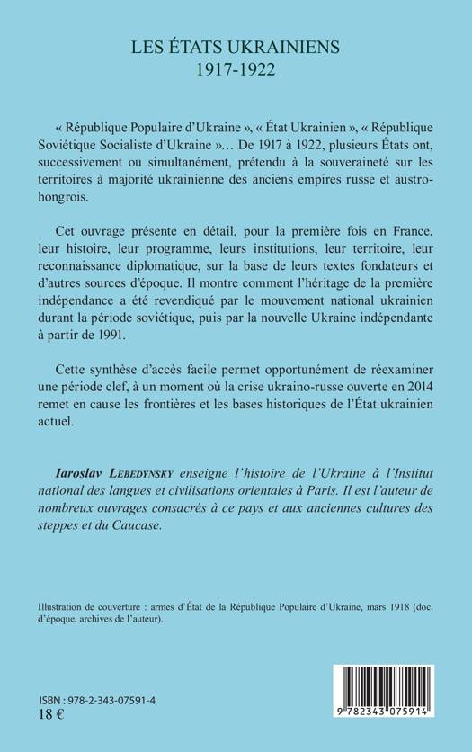 Cet ouvrage présente les États qui ont prétendu à la souveraineté sur les territoires à majorité ukrainienne des anciens empires russes et austro-hongrois de 1917. Il montre comment l’héritage de la première indépendance a été revendiqué par le mouvement national ukrainien durant la période soviétique, puis par la nouvelle Ukraine indépendante à partir de 1991. Cette synthèse permet de réexaminer une période clef, à un moment où la crise ukraino-russe ouverte en 2014 remet en cause les frontières et les bases historiques de l’État ukrainien actuel.