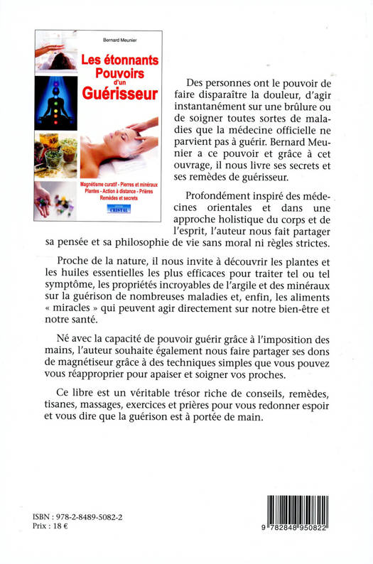 Avec des mots simples un «vieux guérisseur» vous livre ici sans aucune retenue, les secrets qui furent les siens, tout au long de sa vie, consacrée à aider son prochain et en particulier ceux qui souffrent tant physiquement que moralement. Écouter, parler, ressentir, conseiller, donner confiance à celui qui souffre, entreprendre une action bienfaisante qui calme et redonne l'espoir, tels sont les principaux attributs du guérisseur.«Cette «science» de la guérison, qu'on enrichit et améliore tout au long de sa vie, est le plus précieux de tous les biens puisqu'il concerne la santé.» Aussi, notre guérisseur a-t-il décidé d'offrir ce livre, véritable trésor, rempli de remèdes, prières, tisanes, massages, plus une foule de petits secrets strictement personnels qu'il dévoile ici pour soulager, guérir, et redonner espoir à tous ceux qui souffrent.