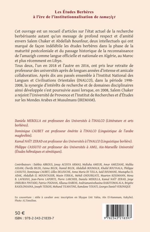 Cet ouvrage est un recueil d’articles sur l’état actuel de la recherche berbérisante autant qu’un message de profond respect et d’amitié envers Salem Chaker et Abdellah Bounfour, deux intellectuels qui ont marqué de façon indélébile les études berbères dans la phase de la maturité postcoloniale et du passage historique de la reconnaissance de l’amazigh comme langue officielle et nationale en Algérie, au Maroc et plus récemment en Libye.