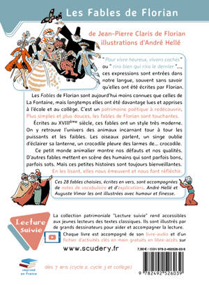 Ce recueil de 28 fables de Florian (1755-1794), écrites en vers, est richement illustré par Hellé et Vimar et accompagné de notes de vocabulaire et d’explications. « Pour vivre heureux, vivons cachés » ou « rira bien qui rira le dernier »..., ces expressions sont entrées dans notre langue, souvent sans savoir qu'elles ont été écrites par Florian. Les Fables de Florian sont aujourd'hui moins connues que celles de La Fontaine, mais longtemps elles ont été davantage lues et apprises à l'école et au collège. C'est un patrimoine poétique à redécouvrir. Plus simples et plus douces, les fables de Florian sont touchantes. Écrites au XVIIIème siècle, ces fables ont un style très moderne. On y retrouve l'univers des animaux incarnant tour à tour les puissants et les faibles. Les oiseaux parlent, un singe oublie d'éclairer sa lanterne, un crocodile pleure des larmes de... crocodile. Ce petit monde animalier montre nos défauts et nos qualités. D'autres fables mettent en scène des humains qui sont parfois bons, parfois sots. Mais ces petites histoires sont toujours bienveillantes ; elles nous émeuvent et nous font réfléchir. De nombreux proverbes français sont tirés des Fables de Florian : "Rira bien qui rira le dernier", "il faut éclairer sa lanterne", "pour vivre heureux vivons caché", "le chemin le plus court n'est pas toujours le meilleur", "chacun son métier et les vaches seront bien gardées"..