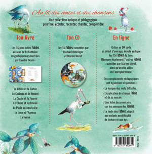 Pour les lecteurs en herbe, les 15 plus célèbres fables de Jean de La Fontaine racontées par Richard Bohringer et Marine Morot Pour lire, écouter et raconter : Le Renard et la Cigogne Le Loup et l’Agneau La Cigale et la Fourmi La Poule aux oeufs d’or Le Rat de ville et le Rat des champs La Grenouille qui veut se faire aussi grosse que le Boeuf Le Corbeau et le Renard Le Coche et la Mouche Le Cochet, le Chat et le Souriceau Le Chat, la Belette et le petit Lapin Le Chêne et le Roseau Le Laboureur et ses Enfants Le Héron Le Lièvre et la Tortue La Laitière et le pot au lait Grâce au QR code à l’intérieur du livre, écoute en ligne les 15 fables du livre et 7 autres fables racontées par Marine Morot. Des compléments pédagogiques sont également disponibles : - le lexique des mots difficiles - l’explication de la morale - une fiche documentaire sur les animaux des Fables - le texte des Fables adapté aux enfants en difficulté de lecture et aux dys
