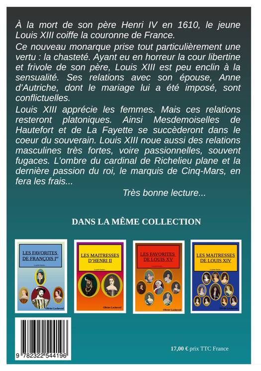 Traiter les galanteries des rois de France par l'humour et l'anecdotique. Voici les grands traits de la petite histoire galante en bande dessinée. À la mort de son père Henri IV en 1610, le jeune Louis XIII coiffe la couronne de France. Ce nouveau monarque prise tout particulièrement une vertu : la chasteté. Ayant eu en horreur la cour libertine et frivole de son père, Louis XIII est peu enclin à la sensualité. Ses relations avec son épouse Anne d'Autriche, dont le mariage lui a été imposé, sont conflictuelles. Louis XIII apprécie les femmes. Mais ces relations resteront platoniques. Ainsi Mesdemoiselles de Hautefort et de La Fayette se succèderont dans le coeur du souverain. Louis XIII noue aussi des relations masculines très fortes, voire passionnelles, souvent fugaces. L'ombre du cardinal de Richelieu plane et la dernière passion du roi, le marquis de Cinq-Mars, en fera les frais...
