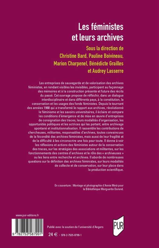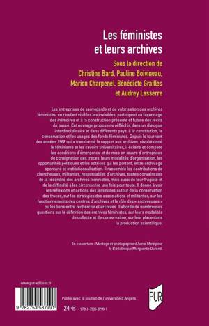 Les entreprises de sauvegarde et de valorisation des archives féministes, en rendant visibles les invisibles, participent au façonnage des mémoires et à la construction présente et future des récits du passé. Cet ouvrage propose de réfléchir, dans un dialogue interdisciplinaire et dans différents pays, à la constitution, la conservation et les usages des fonds féministes. Depuis le tournant des années 1968 qui a transformé le rapport aux archives, révolutionné le féminisme et les savoirs universitaires, il éclaire et compare les conditions d’émergence et de mise en oeuvre d’entreprises de consignation des traces, leurs modalités d’organisation, les opportunités politiques et les actrices qui les portent, entre archivage spontané et institutionnalisation. Il rassemble les contributions de chercheuses, militantes, responsables d’archives, toutes convaincues de la fécondité des archives féministes, mais aussi de leur fragilité et de la difficulté à les circonscrire une fois pour toute. Il donne à voir les réflexions et actions des féministes autour de la conservation des traces, sur les stratégies des associations et militantes, sur les fonctionnements des centres d’archives et le rôle des « archiveuses » ou les liens entre recherche et archives. Il aborde de nombreuses questions sur la définition des archives féministes, sur leurs modalités de collecte et de conservation, sur leur place dans la production scientifique.