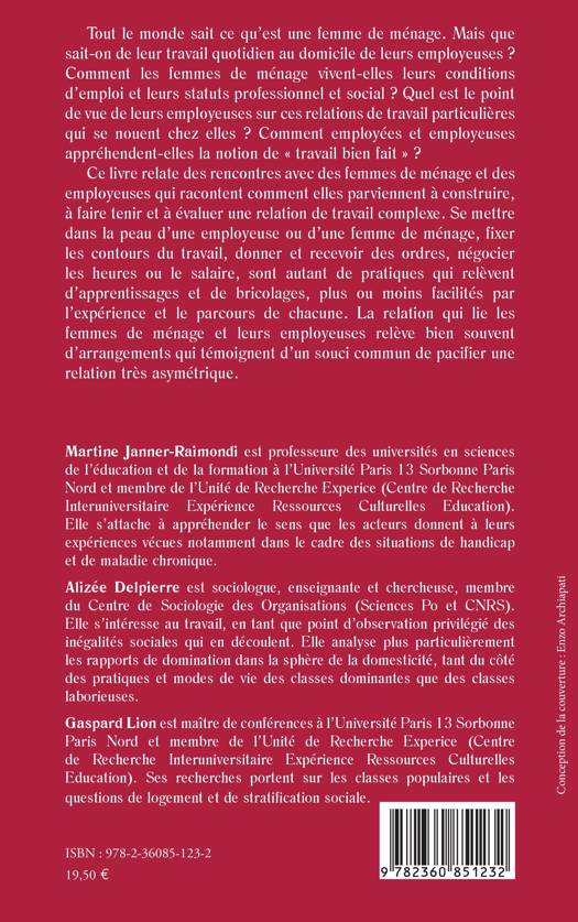 Tout le monde sait ce qu'est une femme de ménage. Mais que sait-on de leur travail quotidien au domicile de leurs employeuses ? Comment les femmes de ménage vivent-elles leurs conditions d'emploi et leurs statuts professionnel et social ? Quel est le point de vue de leurs employeuses sur ces relations de travail particulières qui se nouent chez elles ? Comment employées et employeuses appréhendent-elles la notion de « travail bien fait » ? Ce livre relate des rencontres avec des femmes de ménage et des employeuses qui racontent comment elles parviennent à construire, à faire tenir et à évaluer une relation de travail complexe. Se mettre dans la peau d'une employeuse ou d'une femme de ménage, fixer les contours du travail, donner et recevoir des ordres, négocier les heures ou le salaire, sont autant de pratiques qui relèvent d'apprentissages et de bricolages, plus ou moins facilités par l'expérience et le parcours de chacune. La relation qui lie les femmes de ménage et leurs employeuses relève bien souvent d'arrangements qui témoignent d'un souci commun de pacifier une relation très asymétrique.